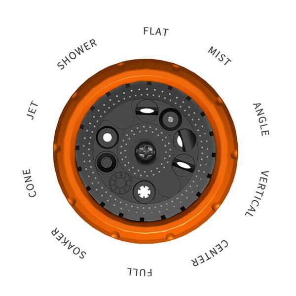 10 Adjustable Spray Patterns: Featuring a versatile dial, our garden hose nozzles offer 10 different spray patterns, including mist, shower, jet, flat, angle, center, stream, cone, full, and vertical. This wide range of options allows you to easily switch between different settings to suit various watering needs, from a soft shower for delicate plants to a high-velocity jet for cleaning tasks.