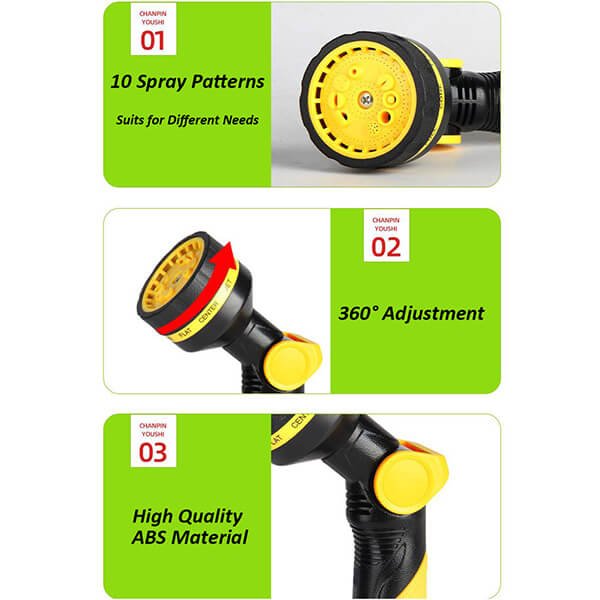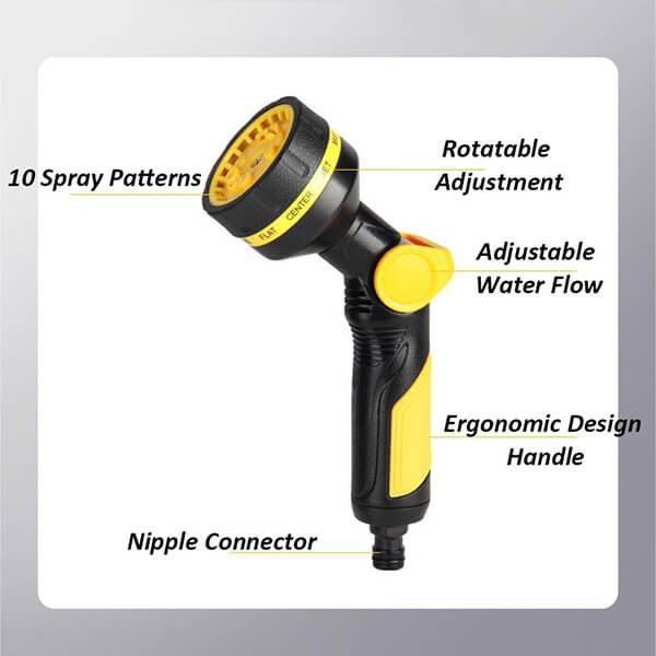 • Versatile Spray Modes: 10 adjustable patterns for different needs.