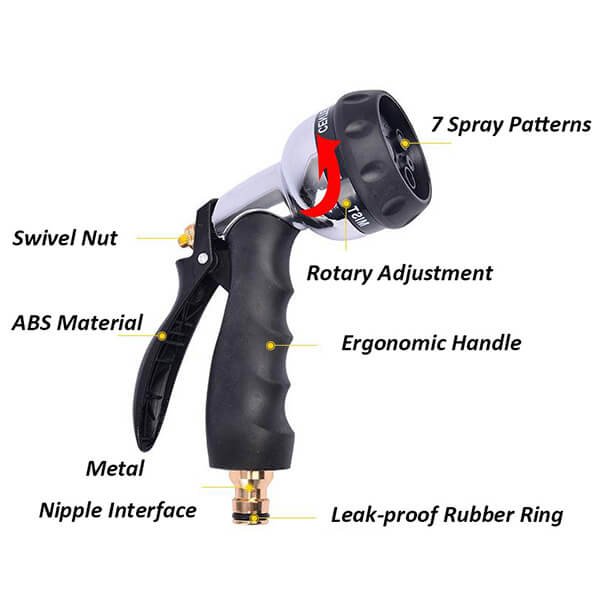 The 7 Patterns Adjustable Metal Water Spray Gun by EVERPEAK stands out for its exceptional durability and versatility. Constructed from advanced materials, including a sturdy alloy and a rubberized surface, this spray gun is built to last and withstand the rigors of daily use. It easily connects to any standard garden hose, ensuring a tight, leak-proof fit, and its 360° adjustment ring allows for precise control of water flow, making it suitable for various cleaning and watering tasks.