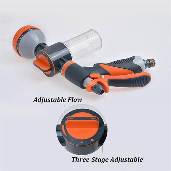 The Foam Gun boasts eight different nozzle settings: water flow, flush, shower, flat, center, jet, mist, and cone. This versatility ensures you have the right water flow for any task, whether it’s a gentle mist for delicate plants or a powerful jet for tough cleaning jobs.
